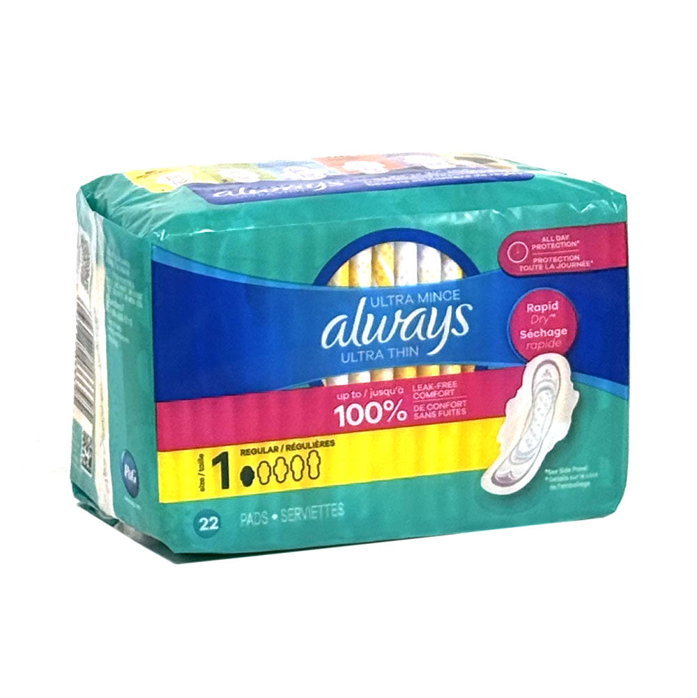 Always Ultra Thin Pad Size 1 comes in a pack of 22 pads. Easy to stock on shelves and a reliable everyday retail item.