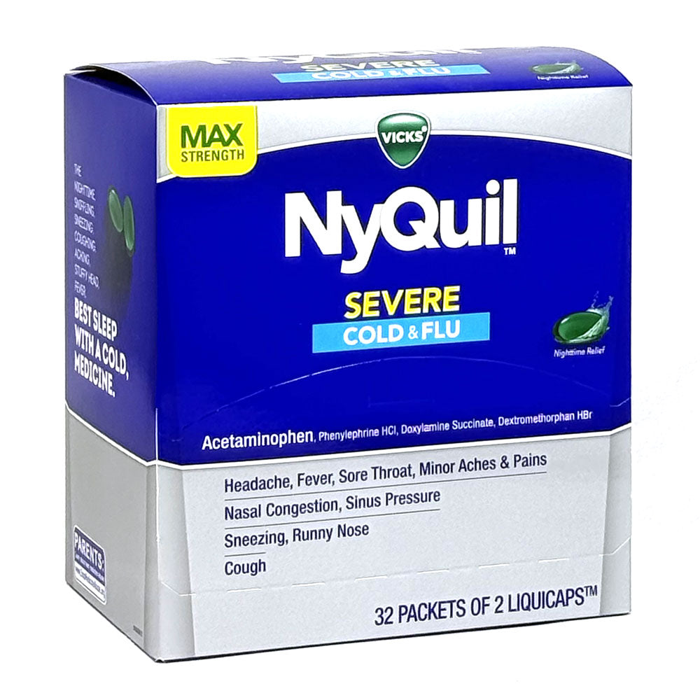 NyQuil Severe Cold & Flu comes in a retail display of 32 packs, each with 2 caplets. Easy to stock on shelves and convenient for grab-and-go sales at checkout counters.