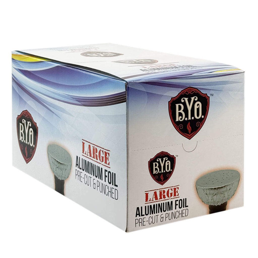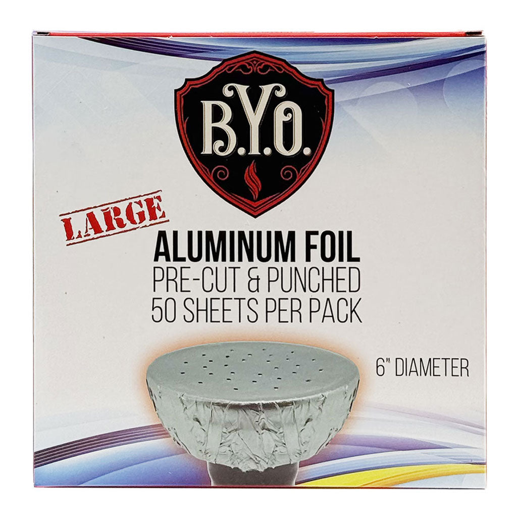 BYO 6" Pre-Punched Aluminum Foils 24/50ct come in a box of 24 packs, each with 50 precut and pre-punched sheets. Measuring 6 inches in diameter, these foils are ready to use and fit most standard hookah bowls.
