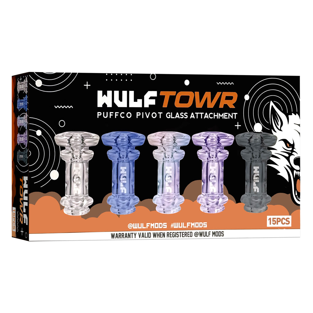 Wulf Mods Towr Puffco Pivot Top is a borosilicate glass attachment designed for the Puffco Pivot. Featuring a unique tower-inspired design, it attaches securely with a ridged base and is available in 5 full-body color options. Each display includes 15 individually packaged units for easy merchandising and retail readiness.